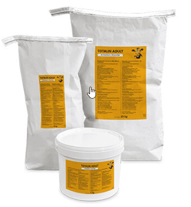 Totalin Adult ist ein Pulver mit Vitaminen, Mineralien und Spurenelementen zur Behandlung von Mangelerscheinungen bei Pferden, das die allgemeine Gesundheit, Fruchtbarkeit und die Unterstützung bei Abnutzungserscheinungen fördert.