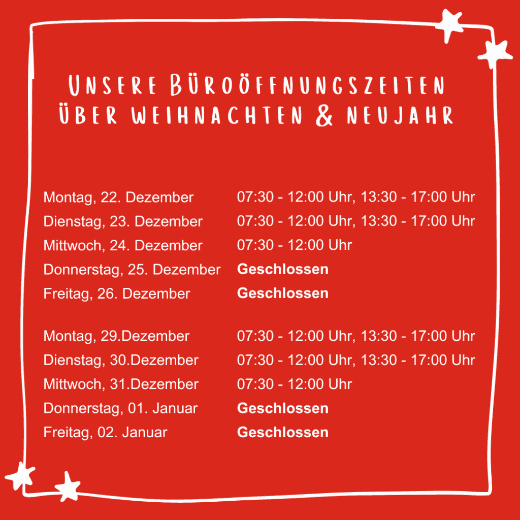 Zögere nicht, uns während dieser Zeit zu kontaktieren. Wir wünschen die zauberhafte Festtage und einen guten Rutsch ins neue Jahr!