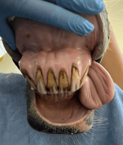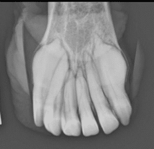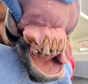 Bei der jĂ€hrlichen Zahnkontrolle von dieser 24-jĂ€hrige Stute fiel bei der Untersuchung dieses Jahr eine VerĂ€nderung der SchneidezĂ€hne auf. Das Zahnfleisch ist aufgetrieben, es befindet sich ĂŒbermĂ€ssigem Zahnstein auf die ZĂ€hnen und auf der rechte Oberkiefer (links im Bild, umkreist) sieht man eine knollige Auftreibung vom Ă€usseren SchneidezĂ€hne. Einzelne ZĂ€hne im Oberkiefer waren zudem etwas locker. Um zu sehen, wie weit die Erkrankung bereits fortgeschritten ist, wurden Röntgenbilder von den SchneidezĂ€hnen im Ober- sowie Unterkiefer gemacht. Dort sah man, dass die ZĂ€hnen auch unter dem Zahnfleisch verĂ€ndert sind, und diese knollige Verformung sich nicht nur auf den einen Zahn begrenzt.
